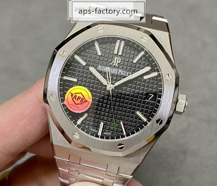 APS工場はこの15500の持つ「黄金比」を完璧に解釈しています。ブラック文字盤に施された「グランド・タペストリー」模様は、光の角度によって表情を劇的に変えます。夜の街の明かりを反射して煌めく時、あるいはオフィスで書類に目を落とす時、この文字盤が放つ陰影は、見る者の視線を釘付けにせずにはいられません。