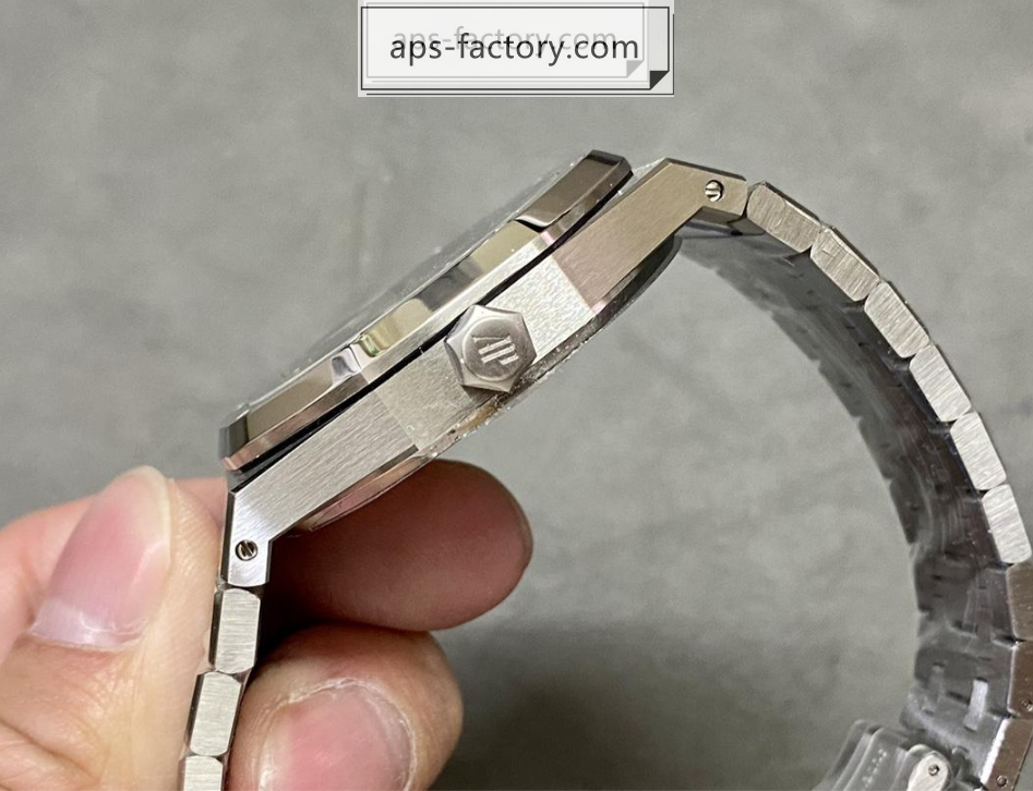 ロイヤルオークを語る上で避けて通れないのが、ケースとブレスレットが一体となった独自の造形美です。APS工場は、ステンレススティールの研磨技術においても妥協を許しません。